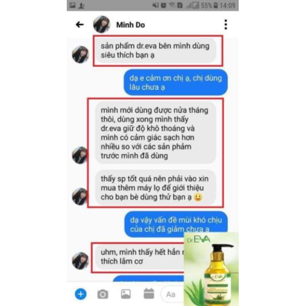 Công dụng: • Làm sạch, khử mùi hôi, giữ mùi thơm vùng kín; • Vệ sinh vùng kín hàng ngày, duy trì độ ẩm tự nhiên và sự mềm mại cho bề mặt da vùng kín; • Ngăn ngừa, làm sạch vi khuẩn gây viêm nhiễm, nấm ngứa; • Hỗ trợ giảm thiểu các triệu chứng ngoài da khi vùng kín nhiễm bệnh như viêm cổ tử cung, viêm nhiễm phụ khoa, nấm ngứa phụ khoa, viêm lộ tuyến cổ tử cung... • Làm lành vết thương, phục hồi niêm mạc hiệu quả. Vì vậy, với phụ nữ đã có gia đình, vùng kín bị tổn thương, xây xát trong quá trình quan hệ vợ chồng, Dr.EVA sẽ giúp kháng khuẩn vết thương, phòng ngừa niễm khuẩn, nấm