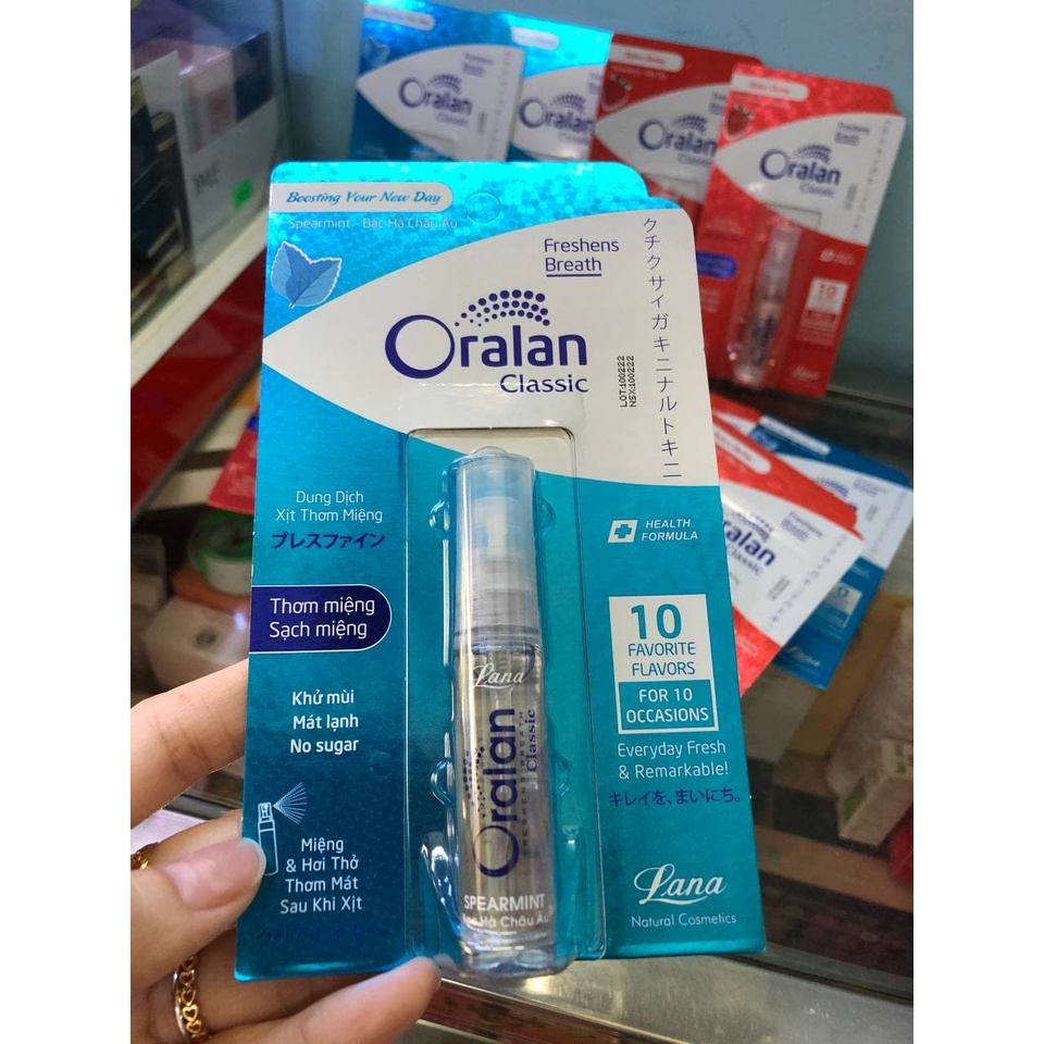 Sạch miệng, chống hôi miệng sau khi ăn uống. Đặc biệt Oralan Classic tấn công và khử ngay mùi thuoc lá. Dung dịch xịt thơm miệng tức thì cho hơi thở thơm tho và mát lạnh. Không chứa đường, không sợ sâu răng, miệng thơm sạch. Dạng chai nhỏ thuận tiện, dễ bỏ túi, dễ mang theo, dễ sử dụng. Thành phần Aqua, Alcohol, Flavor, Mentha Piperita Extract, Mentha Piperita Oil, Potassium Acesulfame, Citric Acid. Hướng dẫn sử dụng Nhấn xịt vào miệng 3 - 4 lần để có ngay hơi thở thơm tho và miệng sạch mát. Oralan Classic an toàn khi nuốt.