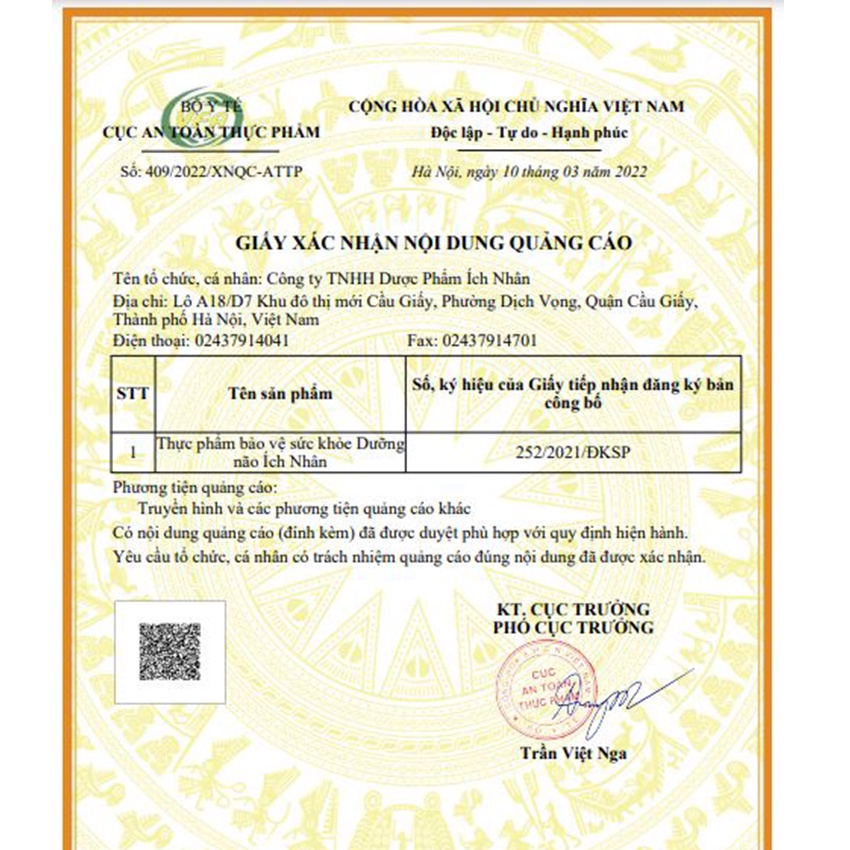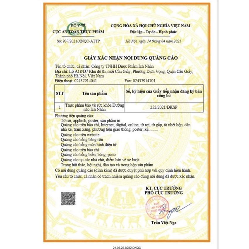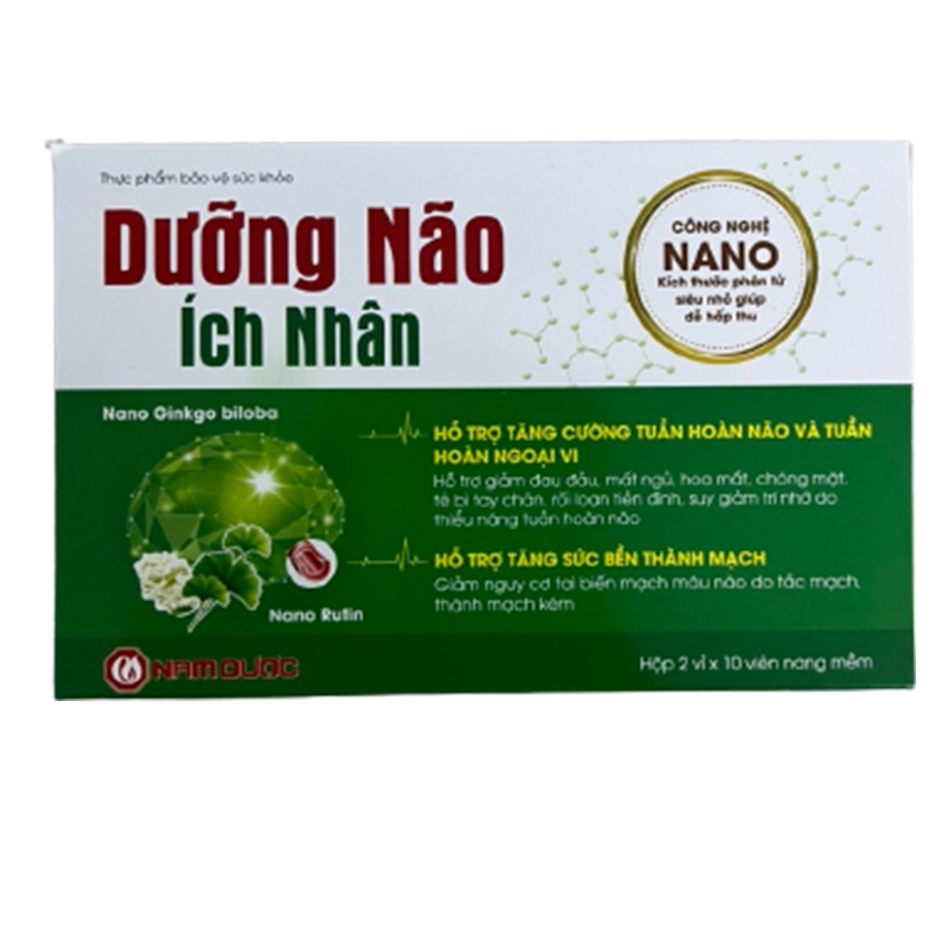 Dưỡng Não Ích Nhân (Hộp 2 vỉ x 10 viên nang) 1. THÀNH PHẦN Mỗi viên nang chứa: - Nano Ginkgo Biloba (Chiết xuất từ Lá Bạch quả): 60mg - NanoRutin (Chiết xuất từ Nụ Hoa Hòe): 25mg - Chất giữ ẩm: Glycerin, Sorbitol, Propylene glycol; Chất làm dầy: Gelatin; Chất nhũ hóa: Polyoxyl hydrogenated castor oil; Chất tạo hương: Vanillin: Vừa đủ 1 viên