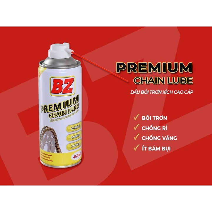Dưỡng sên, bôi trơn sên BZ Premium chain Lube Phù hợp với tất cả các loại xích, bao gồm xích con lăn O RING, X RING và Z RING được sử dụng trên xe mô tô đường phố, địa hình và xe đua.