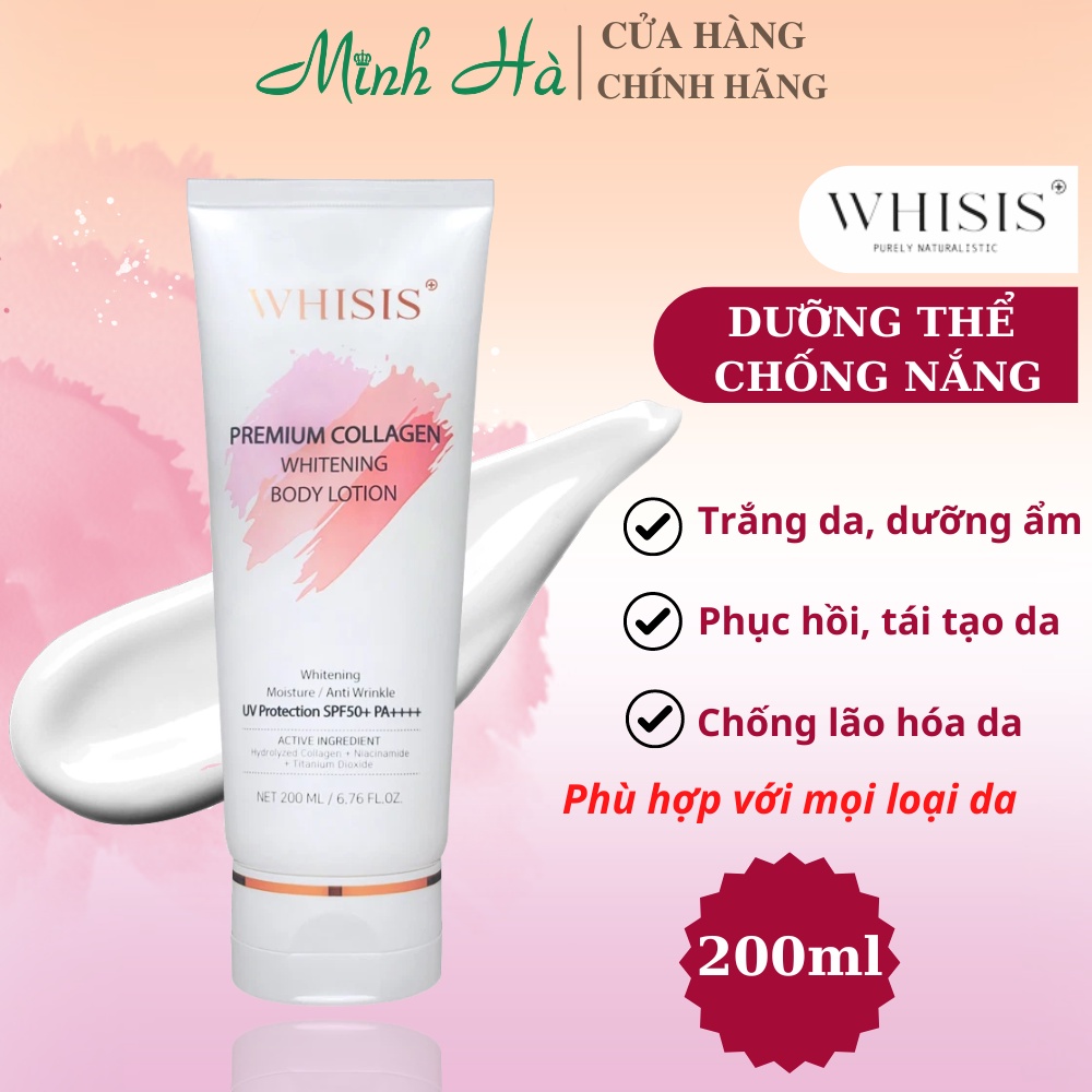 Dưỡng thể chống nắng Whisis Premium Collagen Whitening Body Lotion SPF50+ PA++++ là dòng kem dưỡng thể chứa các thành phần như Hydrolyzed Collagen, Niacinamide, Dimethicone, Sodium Hyaluronate giúp chống lão hoá da, khoá ẩm, hạn chế tình trạng tăng sắc tố da, chống ôxy hoá, nâng cơ da, điều tiết dầu thừa, bã nhờn.