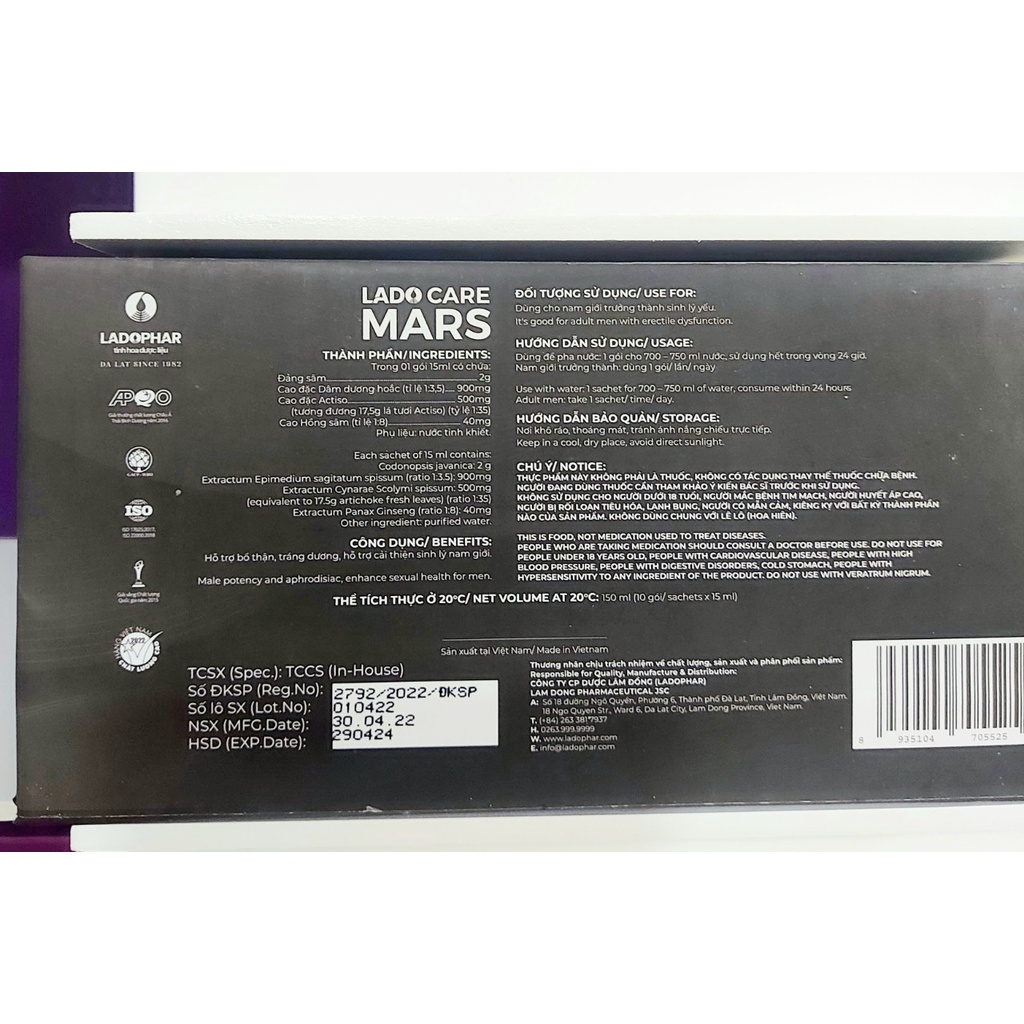 1-THÔNG TIN SẢN PHẨM NƯỚC UỐNG TĂNG CƯỜNG SINH LỰC CHO NAM GIỚI LadoBoost MARS Tên sản phẩm: LadoBoost MARS Thương hiệu: Dược phẩm Lâm Đồng Đà lạt- Ladophar Trong 01 gói 15ml có chứa: - Đảng sâm: 2g - Cao đặc Dâm dương hoắc (tỉ lệ 1:3,5): 900mg - Cao đặc Actiso: 500mg (tương đương 17,5g lá tươi Actiso) (tỷ lệ 1:35) - Cao Hồng sâm (tỉ lệ 1:8): 40mg Phụ liệu: nước tinh khiết. Công dụng: Hỗ trợ bổ thận, tráng dương, hỗ trợ cải thiện sinh lý nam giới. Quy cách: hộp 10 gói x 15ml Hạn dùng: 24 tháng từ ngày sản xuất. 2 - CÔNG DỤNG SẢN PHẨM LadoBoost MARS: Dành riêng cho phái mạnh, MARS là tên gọi Thần Chiến Binh – tượng trưng cho sức mạnh nam tính chinh phục thử thách. MARS là tổng hợp của đa dạng chiết xuất từ thảo dược quý cổ truyền, tăng cường sinh lý và bổ thận tráng dương cho nam giới. MARS – đem lại sự tự tin và sức mạnh một cách tự nhiên và an toàn. Cũng là món quà tuyệt vời cho nam giới từ Ladophar. Sản phẩm được kiểm chứng lâm sàn và đã được nhiều y bác sĩ tin dùng. 3- CÁCH SỬ DỤNG LadoBoost MARS:: Người dùng có thể sử dụng LadoBoost MARS theo hai cách sau: - Cách 1 cải thiện chức năng: Các thầy thuốc khuyên dùng: 8 ngày liên tiếp sáng 1 gói, chiều 1 gói sau bữa ăn. 8 ngày tiếp theo uống ngày 1 lần vào buổi chiều sau khi ăn. Liệu trình trên áp dụng 3 tháng 1 lần - Cách 2 làm chậm quá trình suy giảm chức năng, nhu cầu bồi bổ cơ thể: Có thể uống 1 gói mỗi ngày. 4- CÁCH BẢO QUAN NƯỚC UỐNG LadoBoost MA ĐỂ GIỮ LẠI 100% CHẤT LƯỢNG DƯỢC LIỆU BÊN TRONG: Bảo quản nơi khô ráo, thoáng mát tránh anh sáng, đặc biệt là ánh nắng trực tiếp sẽ làm phân hủy dược chất của thảo dược. 5- LƯU Ý: Sản phẩm không phải là thuốc nên không thể thay thế thuốc trong điều trị bệnh. Sản phẩm từ 100% thảo dược nên cực kỳ an toàn với người sử dụng, không bị quá liều.