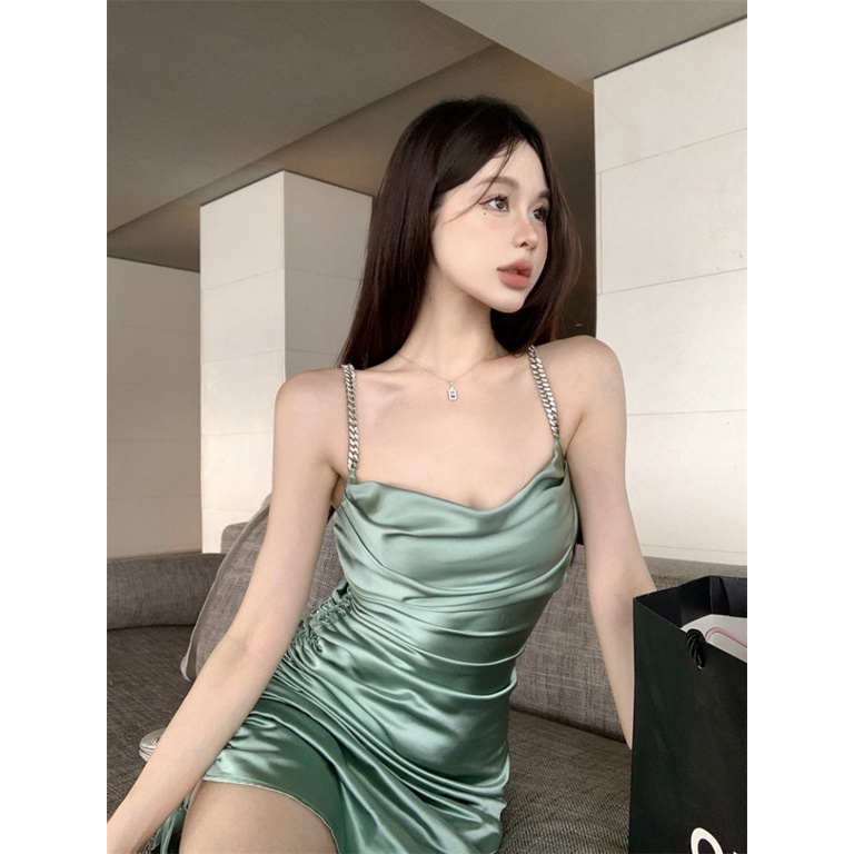 Giới thiệu [F & X] Đầm Hai Dây Vải Satin Cao Cấp Xếp Ly Phối Dây Rút Thiết Kế Độc Đáo Thời Trang Mùa Hè Nóng Bỏng Cho Nữ