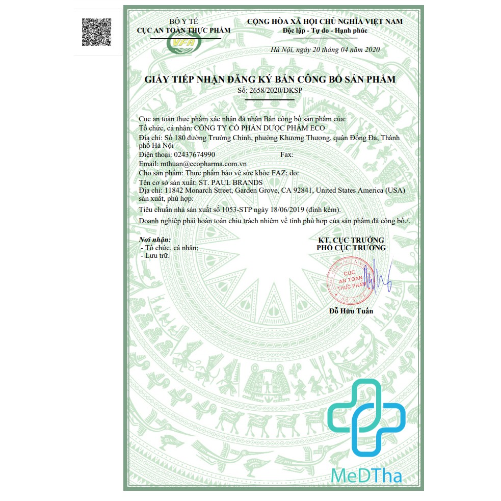 ⚫️ NSX và HSD: Ghi trên nhãn chính của sản phẩm ⚫️ Nhà sản xuất: St. Paul Brands - 11842 Monarch Street, Garden Grove, CA 92841, U.S.A ⚫️ Nhập khẩu và phân phối: Công ty Cổ phần Dược phẩm ECO ⚫️ Bảo quản: Nơi khô ráo, thoáng mát, nhiệt độ dưới 30 độ C, tránh ẩm và ánh nắng mặt trời, để xa tầm tay trẻ em