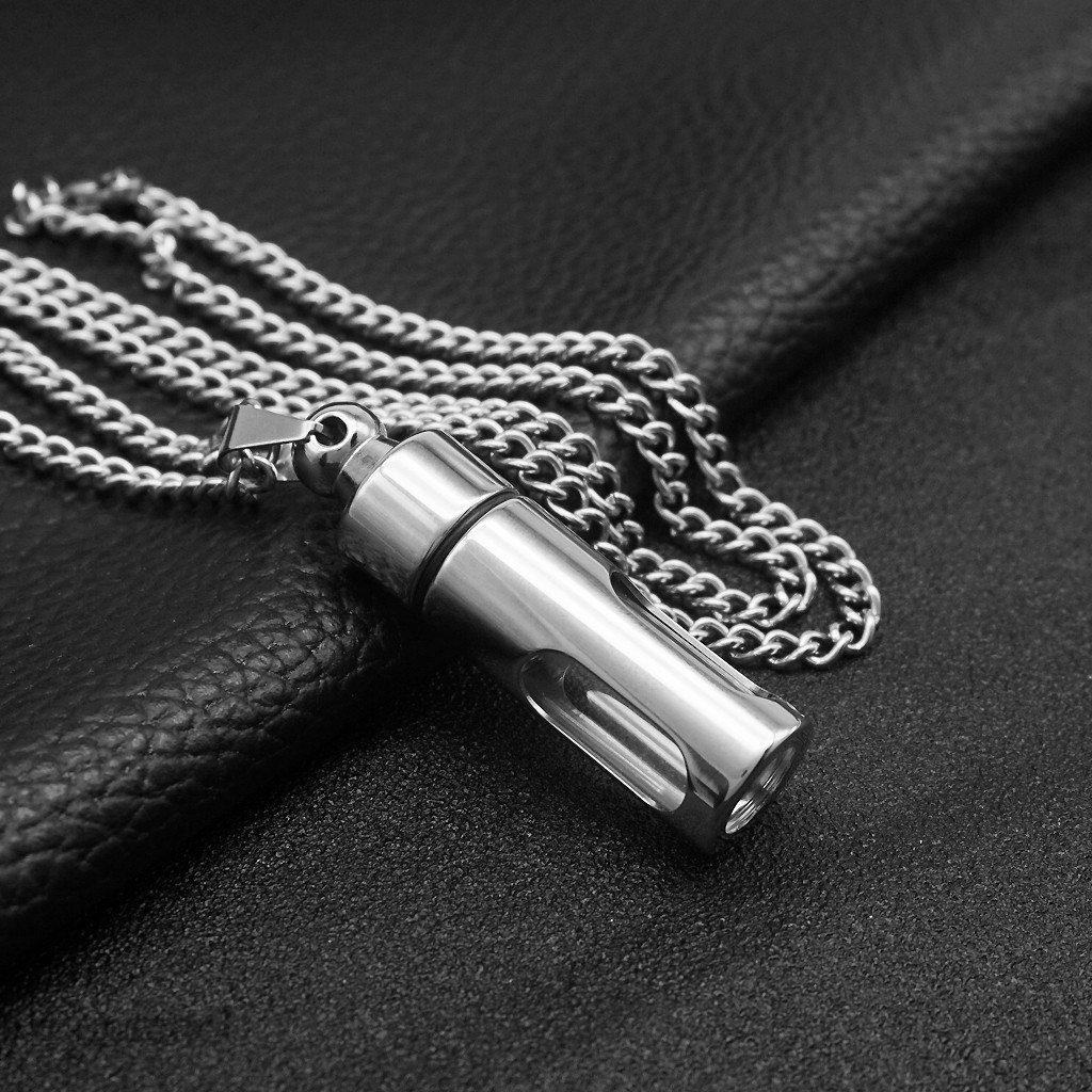 Description: Material: Stainless Steel,Glass Bottle; Pendant diameter approx. 13mm, chain 55x0.35cm/ 21.6x0.13 inch; Cremation Jewelry, it also known funeral jewelry,remembrance jewelry or memorial jewelry is used as a remarkable way to memorialize a loved one or loved pet; This stainless steel keepsaker urn necklace features cylinder-shaped and with glass bottle in it. You can open it by screw, bottle capable to hold pill powders or liquid; Package Includes: 1 Piece Urn Pendant Chain Necklace