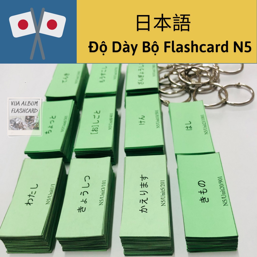 FLASHCARD TỪ VỰNG N5 ( 2 MẶT) KÈM KANJI Giới thiệu: - Được soạn thảo từ sách みんなの日本語 1 (Minnano Nihongo 1) từ bài 1 - 25. - Gồm 1049 từ vựng kèm Kanji: mặt trước là từ vựng, mặt sau là Kanji + âm hán việt + nghĩa từ vựng. - Được in trên giấy bìa màu, kích thước 3cm x7cm - Mặt trước flashcard được in Unit mấy và được đánh số từ 1 đến 1048, vậy nên dễ dàng ôn luyện, tra từ và sắp sếp theo từng bài. Lợi ích: - Giúp đẩy nhanh quá trình học từ vựng và nắm vững từ vựng N5 - Đồng thời bạn sẽ được học và ôn luyện cả chữ hán, giúp nâng cao vốn chữ hán. - Giúp quá trình ôn luyện trở nên dễ dàng, nhanh chóng và nhớ lâu. Ưu đãi: - Khi đặt hàng tại shop, đơn hàng sẽ đi kèm với 2 khoen tròn. SHOP CAM KẾT GIAO HÀNG ĐÚNG NHƯ NHỮNG GÌ ĐÃ MÔ TẢ VÀ SẴN SÀNG GIẢI ĐÁP NHỮNG THẮC MẮC CỦA QUÝ KHÁCH MỘT CÁCH TẬN TÂM NHẤT.