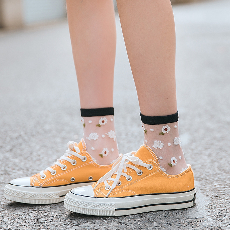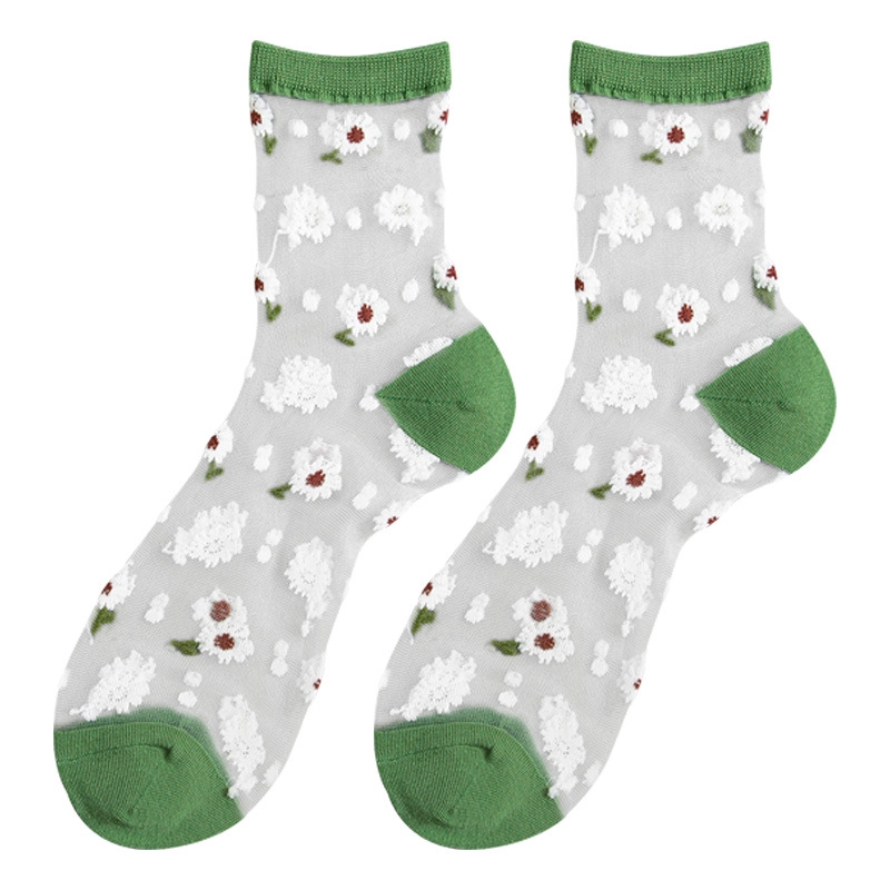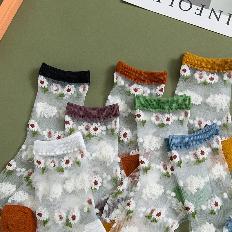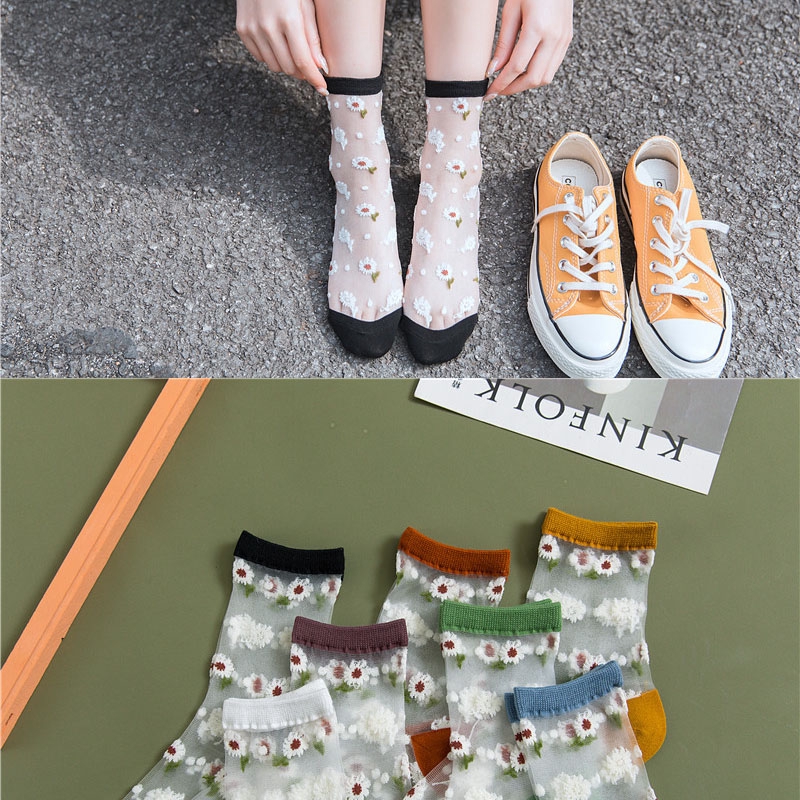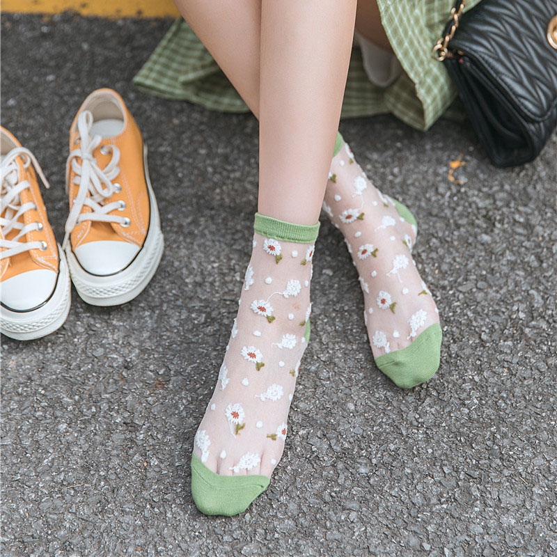 Giới thiệu Flowers Fishnet Sheer Socks Summer New Fashion Ultra-thin Transparent Glass Silk Ladies Tulle Socks Lace Cool Sexy Women Socks