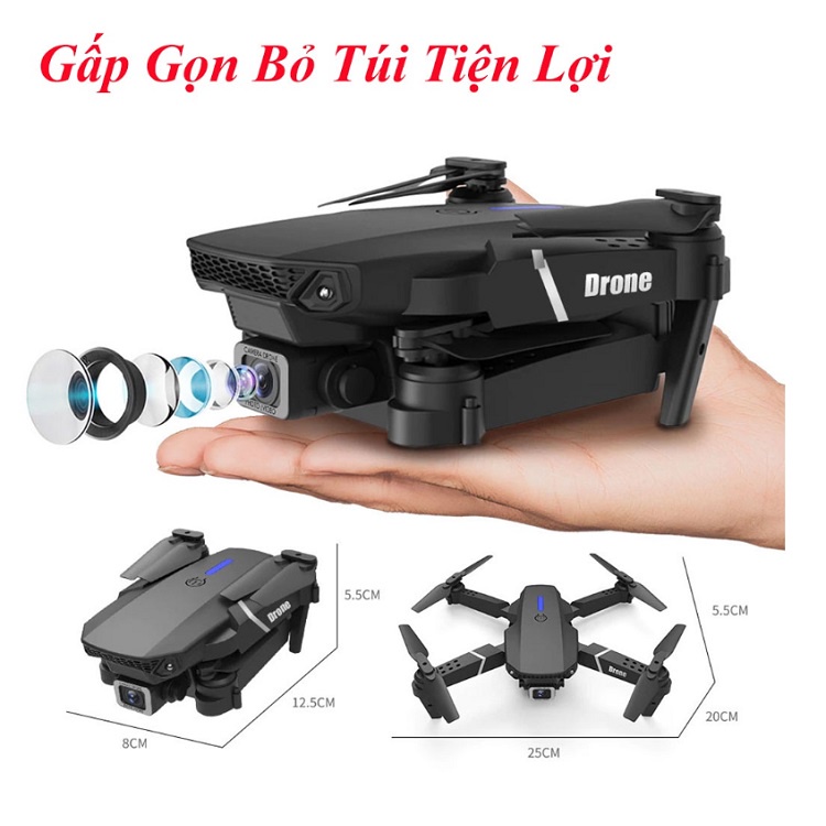 Flycam Mini Cao Cấp Điều Khiển Từ Xa 4k Dòng E88 - Có 2 Camera Chống Rung Quang Học mô tả flycam E88 - chống rung 1. Cánh tay có thể gập lại, nhỏ gọn và dễ dàng mang theo. 2. Chức năng chế độ giữ độ cao, bay ổn định. 3. Trong chế độ không đầu, không cần điều chỉnh vị trí của máy bay trước khi bay. 4. Sử dụng chức năng quay lại một phím để dễ dàng tìm đường về nhà. 5. Công nghệ chống nhiễu -2.4GHz tiên tiến. 6. Có 4 chức năng đi lên, hạ xuống, tiến, lùi, bay trái, bay phải và xoay 360 °. 7. Con quay hồi chuyển 6 trục, chuyến bay ổn định hơn và điều khiển thuận tiện hơn. 8. Có Đèn LED giúp bay ngoạn mục hơn, đặc biệt là trong bóng tối. 9. Flycam mini Drone F87. Thời gian bay: khoảng 15 phút. Thời gian sạc 60-70 phút. 10. Khoảng cách điều khiển từ xa: Tối đa 100m. 11. Camera 4K 16MP Độ phân giải pixel cực rõ
