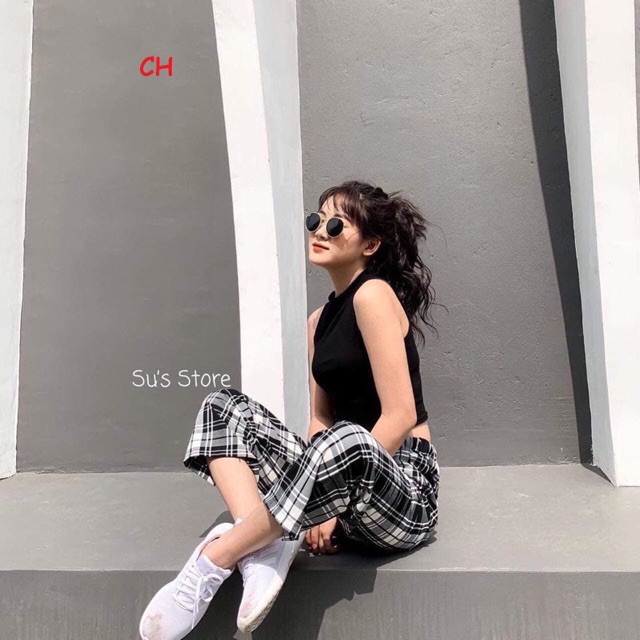 Sét áo ba lỗ đen kèm quần kẻ COH0320 💋 Thông tin sản phẩm: Chất liệu: Tixi - Thô Màu sắc: Đen Sản phẩm nữ Free size dưới 1m62, 40-52kg tùy chiều cao