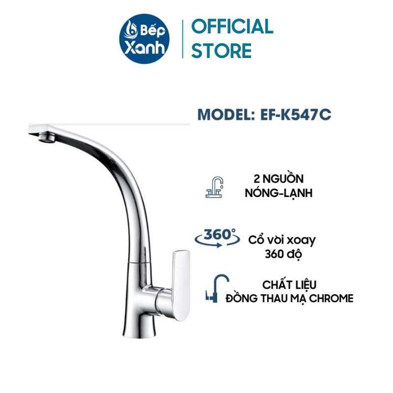 - Chất liệu đồng thau mạ Chrome Vòi rửa chén EF-K547C chất liệu đồng thau mạ crom sáng loáng, bền bỉ mang lại cảm giác tươi sáng trong căn bếp. Ngoài ra, ưu điểm của chất liệu này chịu nhiệt tốt, chống ăn mòn, chống thấm nước và chống bám bẩn nên rất dễ vệ sinh.