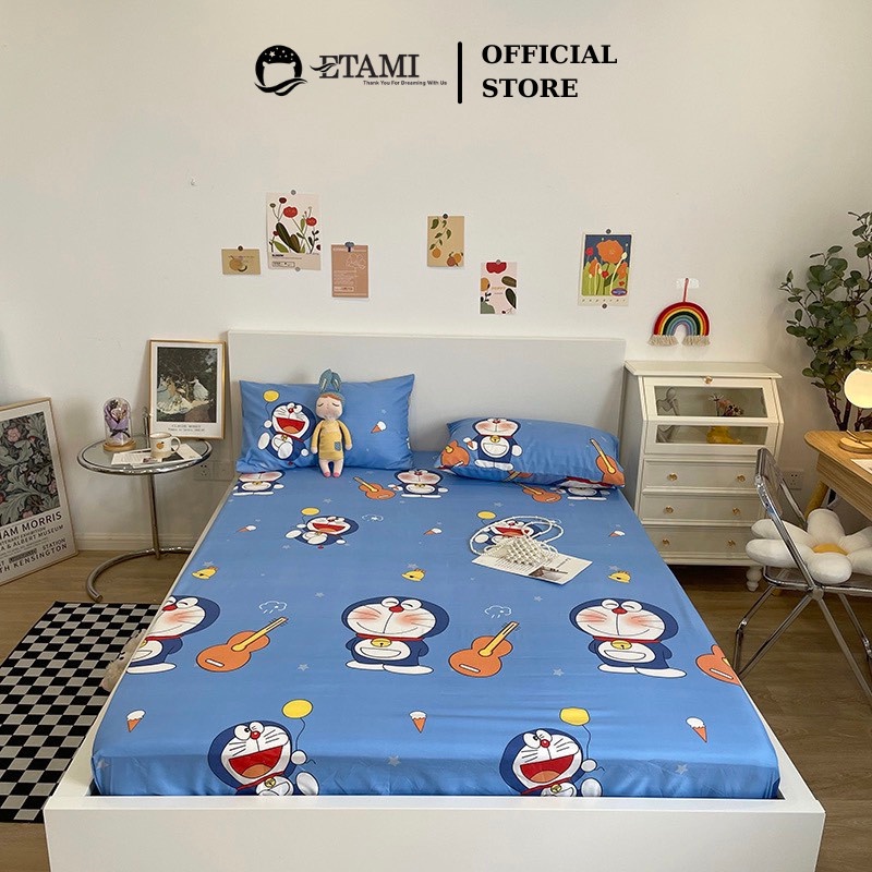 Giới thiệu Bộ ga gối ETAMI drap giường cotton poly 5D, ga trải giường + 2 vỏ gối nằm màu doremon