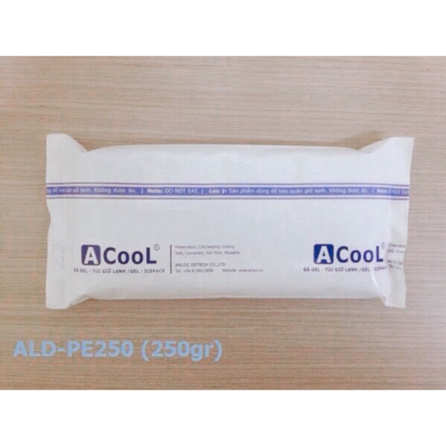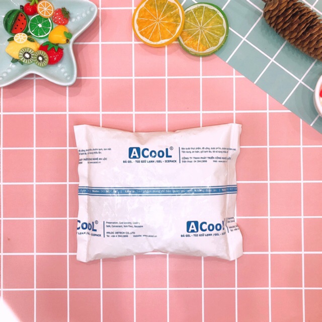 Qui cách: 250g gói dài Công dụng Thực phẩm - Đá Gel ACooL dùng bảo quản giữ lạnh sữa tươi, sữa mẹ, bình sữa, váng sữa, sữa chua, ... - Bảo quản giữ lạnh bánh, kẹo, chocolate tươi, ... - Bảo quản giữ lạnh thực phẩm, thịt cá tươi sống, đồ ăn, nước uống, ... - Bảo quản giữ lạnh rau củ quả, không gây đọng nước làm hư hại, ủng nát rau quả.. Y tế: - Bảo quản dược phẩm, thuốc, vắc-xin, mẫu bệnh phẩm, ... - Chườm nóng, lạnh khi bị sốt, vết thương bị bầm tím Làm mát: - Sử dụng Đá Gel trong quạt làm mát ( tái sử dụng nhiều lần, không tạo hơi nước gây hỏng, chập các thiết bị điện ). Cách sử dụng - Vệ sinh Túi Đá Gel ACooL trước khi cấp đông. - Cấp đông bằng kho lạnh hoặc tủ đông ( thời gian cấp đông phụ thuộc vào độ lạnh của thiết bị cấp đông ) - Sử dụng hiệu quả nhất trong Thùng giữ nhiệt, thùng xốp, túi giữ nhiệt. - Túi giữ lạnh ACooL có thể dùng được nhiều lần, tuy nhiên thời gian giữ lạnh sẽ giảm dần. Lưu ý khi sử dụng - Đá Gel không được ăn hay uống - Để xa tầm tay của trẻ em. - Nên để Túi Đá Gel còn nguyên vẹn không làm rách bao bì để chất lỏng tràn ra ngoài dính vào thức ăn đồ dùng