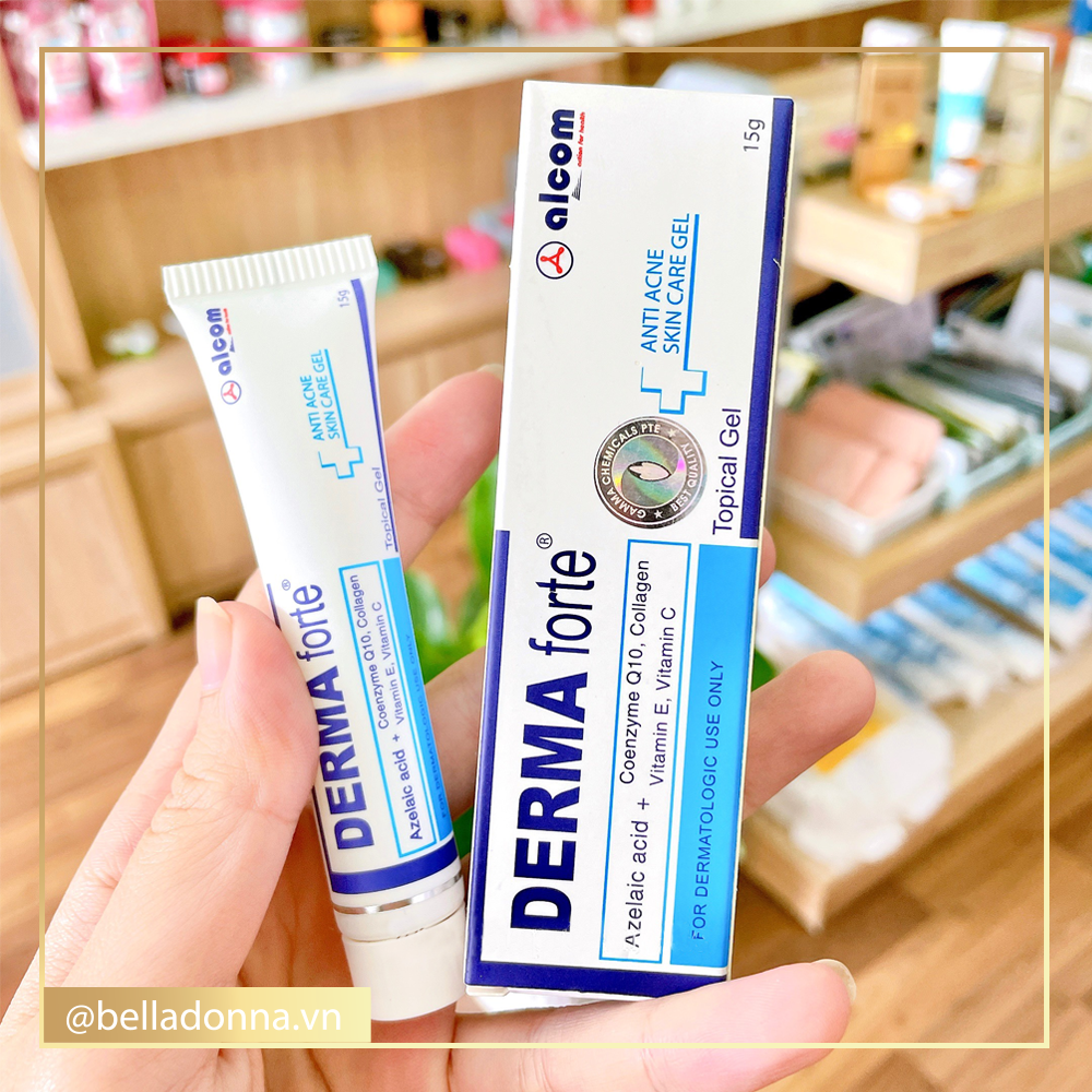 - Thành phần và Công dụng => Azelaic acid 20% Đây là hoạt chất có họ AHA với đặc tính làm se mụn nhanh, bạc sừng, giúp bình thường lớp sừng bề mặt da. Ngoài ra azelaic acid có tác dụng ức chế enzym terosynase trong việc hình thành sắc tố da melanin từ đó giảm thiểu tình trạng tăng sắc tố sau vieem (thâm mụn). Chính vì vậy mà Derma Forte ngoài giảm mụn hiệu quả còn có khả năng giảm thâm tốt nhất là thâm đỏ và thâm nông sau mụn + Azelaic acid có nồng độ bao nhiêu hiệu quả? Theo các nghiên cứu khoa học, Azelaic acid có nồng độ 15 – 20% thì hoạt động tối ưu nhất, và tốt nhất là ở dạng bào chế dạng gel. Azelaic acid 20% có đặc tính xóa thâm và giảm các vết sắc tố da tương đương với hydroquinone 2% (được đánh giá là có khả năng giảm thâm và điều chỉnh sắc tố da tốt nhất hiện nay. Tuy nhiên có xuất hiện tác dụng vụ). Alzelaic 20% được cho là an toàn hơn, thậm chí là có thể sử dụng cho phụ nữ có thai => Vitamin C (Ascorbic acid) + Da bị mụn thì thường dễ nhạy cảm hơn: mẩn đỏ, kích ứng, yếu. Vitamin C làm tăng sức đề kháng, giảm nguy cơ giãn mạch và làm tăng sức bền thành mạch. Từ đó, giúp da được phục hồi nhanh hơn. Tuy nhiên nếu sử dụng vitamin C liều cao ngay thời gian đầu để giảm mụn sẽ dễ làm da bị kích ứng, dễ mẩn đỏ. Nhưng trong sản phẩm Derma Forte, vitamin C được giới hạn ở nồng độ thấp, dưới 5%, giúp phục hồi làn da một cách từ từ, khiến da dễ thích nghi => Vitamin E + Trong Derma Forte có vitamin E, sẽ giúp cho da được cấp ẩm tốt hơn, đồng thời là giúp chống lão hóa và chống oxi hóa da. Khi da được cấp ẩm thì thâm sẽ giảm nhanh hơn. Sự cân bằng dầu nước là một trong những yếu tố quan trọng nhất của quá trình giảm mụn thì vitamin E làm được điều này