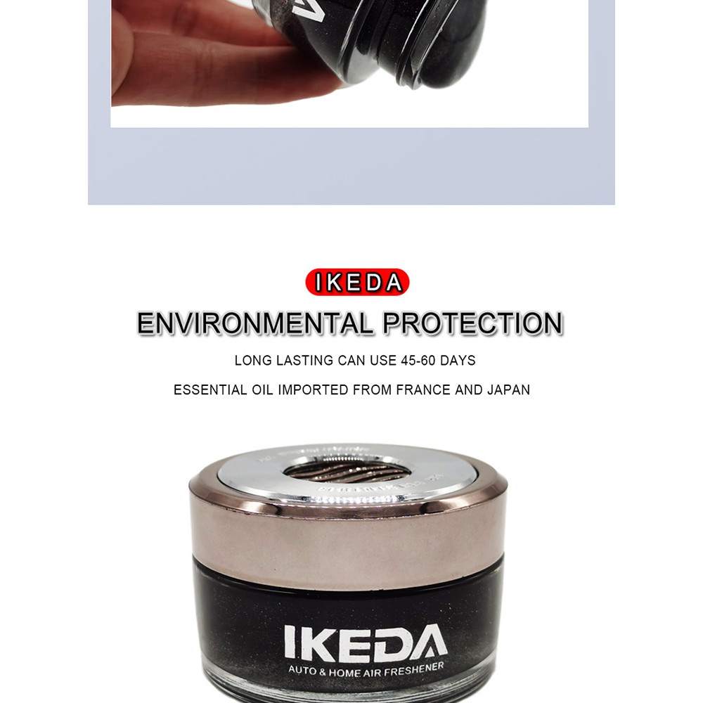 IKEDA là thương hiệu chuyên sản xuất nước hoa, tinh dầu, sáp thơm cho ô tô được thành lập từ năm 2002. Sản phẩm của IKEDA được phân phối ở thị trường Nhật Bản, Trung Quốc, Asian, Mỹ và các nước Châu Âu. Gel thơm IKEDA SOSA được đựng trong chai thủy tinh sang trọng với chất gel lấp lánh sắc đen huyền bí, mùi thơm được kết tinh từ tinh dầu thiên nhiên Nhật Bản. Gel thơm IKEDA rất phù hợp để khử mùi cho ô tô cũng như văn phòng, nhà ở, khách sạn...Gel thơm IKEDA có 4 loại mùi hương là New Car (chuyên khử mùi xe mới), Lemon Squash (hương chanh), White Musk (xạ hương), Blue Squash (hương đại dương thơm mát)