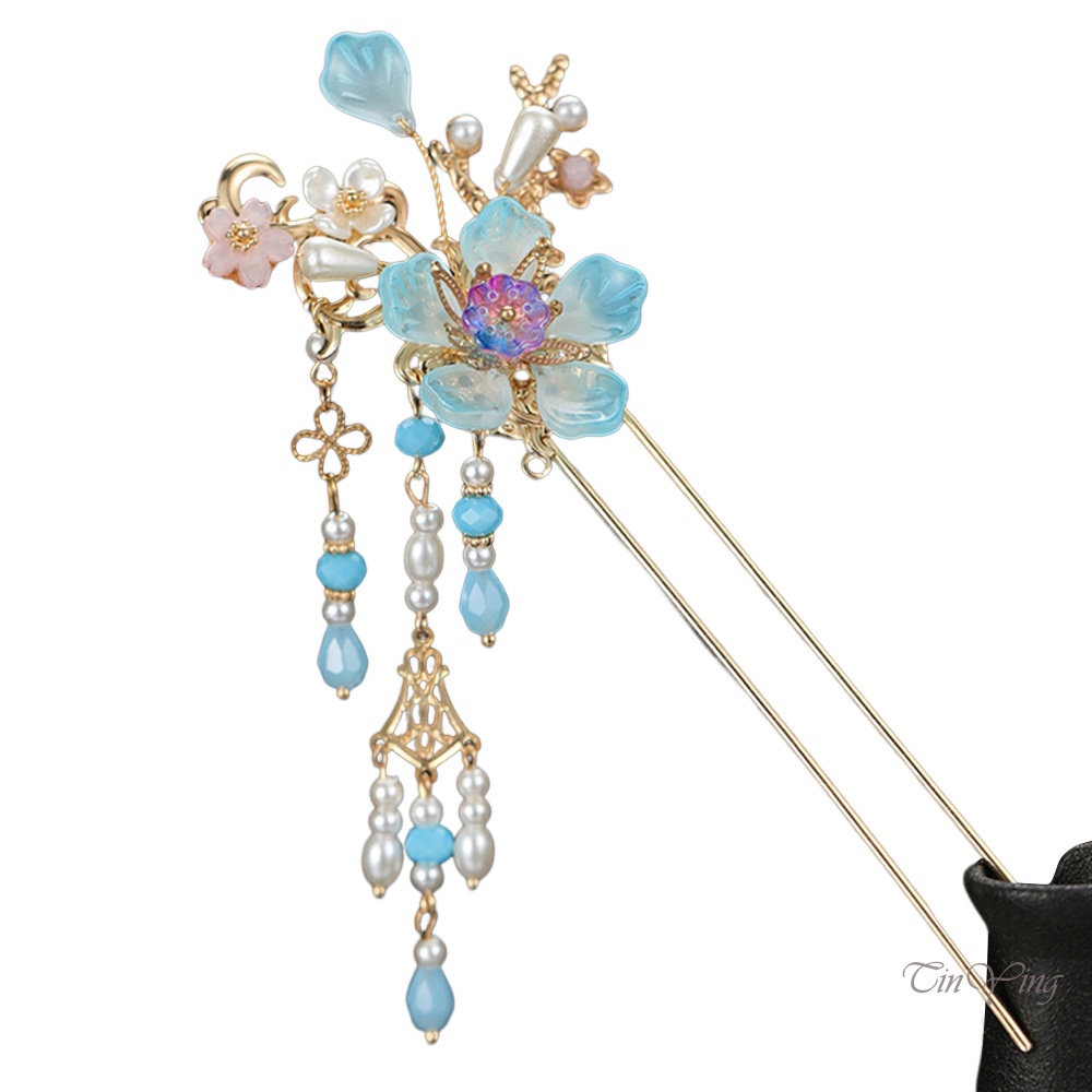 Giới thiệu GETNOIVAS Trâm Cài Tóc Chữ U Hình Bông Hoa Màu Sắc Xanh Dương Phối Tua Rua Màu Vàng Kim Cho Sườn Xám / Hán Phục