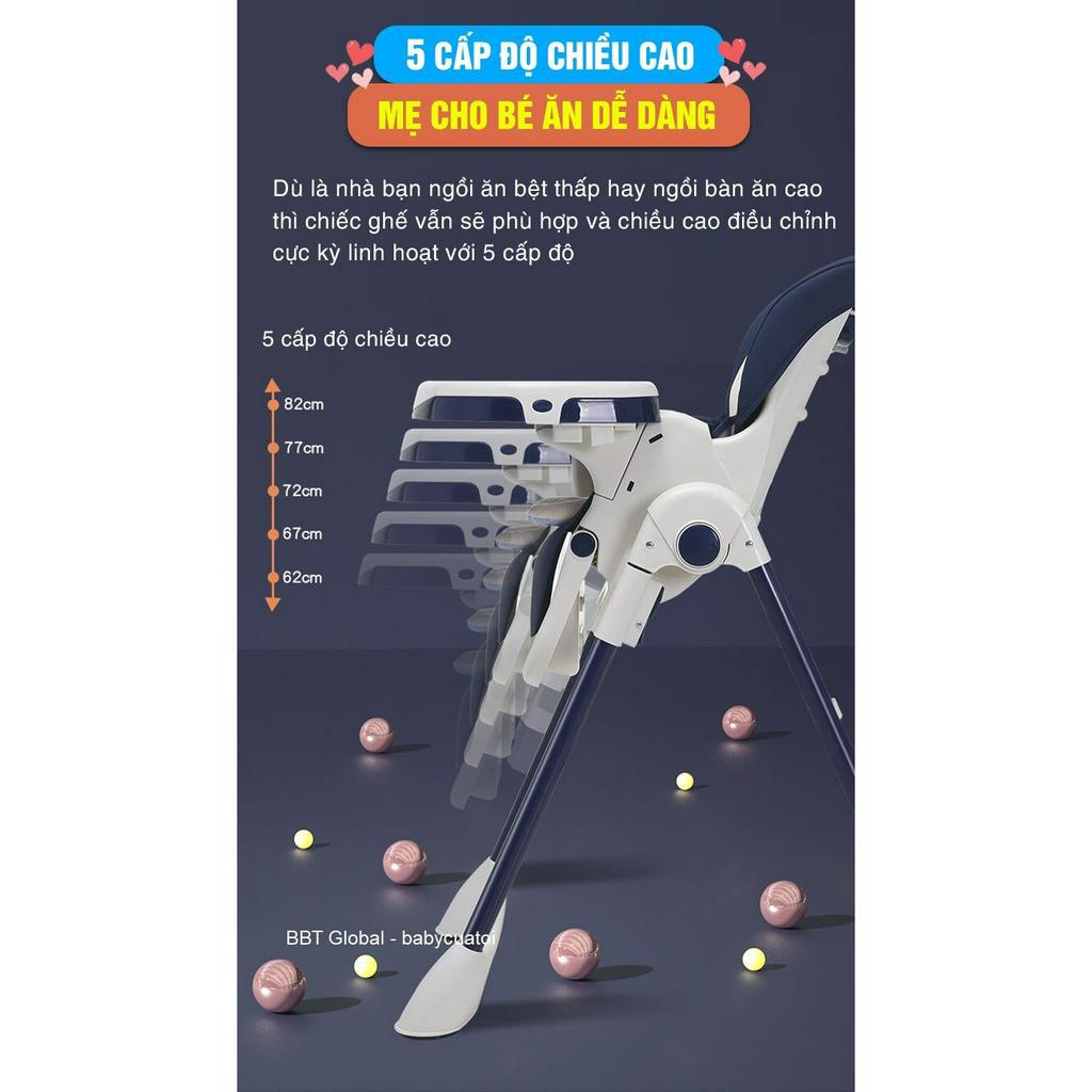 - Thương hiệu: BBT Global - Dành cho bé: 6th đến 5 tuổi - Kích thước: 80*56*98cm - Bảo hành: 03 năm, 1 đổi 1 trong 100 ngày nếu do lỗi của nhà sản xuất - Chỉnh được 5 cấp độ chiều cao, nhiều tư thế: ngồi ăn, ngồi chơi, nằm ngủ nghỉ và 3 khoảng cách bàn ăn - Gấp lại nhỏ gọn, thao tác đơn giản - Tích hợp bánh xe, di chuyển nhẹ nhàng, êm ái - Đệm 2 lớp: 1 lớp da chống thấm nước, dễ vệ sinh, 1 lớp đệm êm ái cho mùa đông - Chất liệu: nhựa nguyên sinh, da PU, thép chịu lực