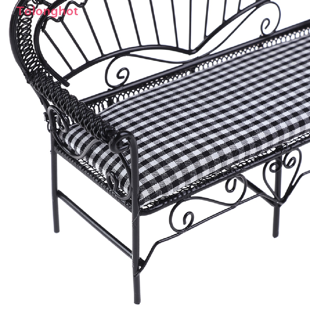 Búp bê nhà thu nhỏ đồ nội thất ghế đôi băng ghế sắt với thảm trang trí sân vườn ngoài trời.