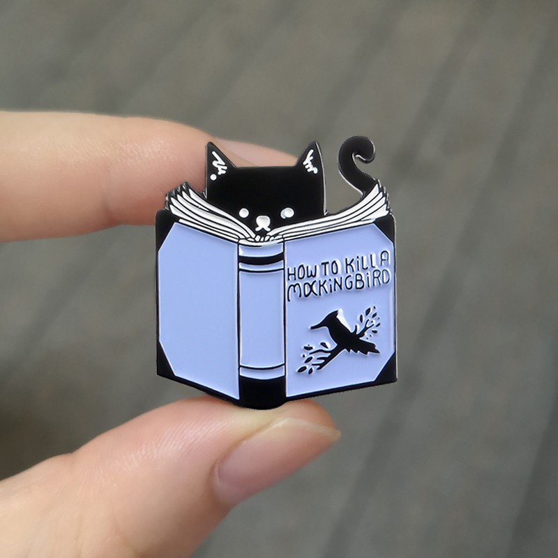 Ghim cài áo hình chú mèo hoạt hình dễ thương đang đọc sách "Làm thế nào để giết một con chim nhại" trang sức kiểu động vật