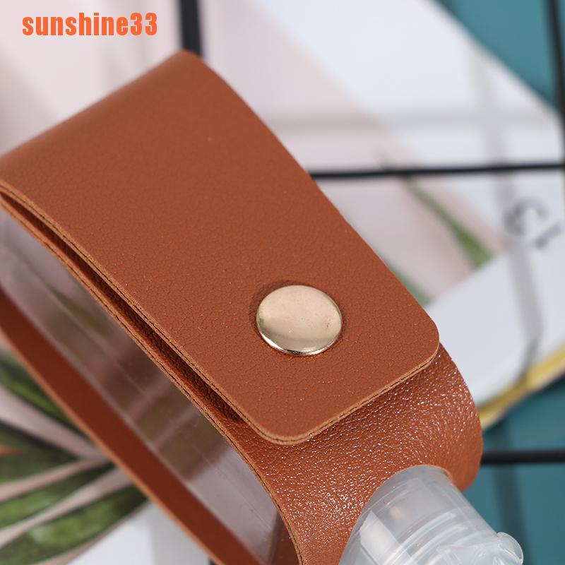 Small travel plastic bottle with leather fixed bag