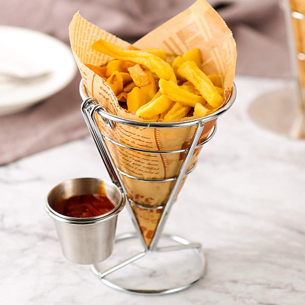 Tên : Giỏ chiên Chất liệu : Sắt tráng Màu bạc Kích thước : khoảng 10x14,5cm Nội dung gói — 1 x Đế chiên Chất liệu : khung dây kim loại. mạ. cứng không dễ biến dạng Giá đỡ khoai tây chiên sử dụng giấy sáp ( không bao gồm) để đựng thức ăn. cùng với cốc nhúng bằng thép không gỉ yêu thích của bạn Dễ dàng làm sạch : rửa tay bằng vải mềm. chất tẩy rửa nhẹ và lau khô khăn - không rửa bằng chất tẩy rửa mạnh hoặc mài mòn - không cho vào máy rửa bát ; giỏ hình nón không được khuyến khích sử dụng cho lò vi sóng Phục vụ các món ăn theo phong cách : một cách thú vị để phục vụ các món ăn có thể chia sẻ yêu thích của bạn , món khai vị hoặc thức ăn nhẹ Tuyệt vời cho nhiều loại thực phẩm , khoai tây chiên , cá và khoai tây chiên , vòng hoặc dây hành tây. viên falafel, tempura, calamari , khoai tây chiên , que mozzarella , cá que , v.v . Quầy khoai tây chiên kiểu Pháp Giá đựng đồ ăn nhẹ Giỏ trưng bày đồ ăn nhẹ có cốc đựng nước sốt Hình nón Món khai vị Khoai tây chiên Tự chọn rau củ quả