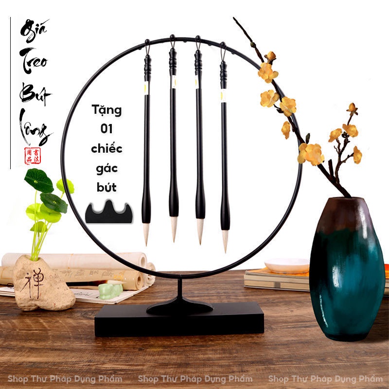 THỐNG SỐ SẢN PHẨM: - Bao gồm: 1 giá treo bút lông + Tặng 1 gác bút màu đen. - Kích thước: Đường kính khung tròn 35cm, tổng chiều cao 41cm, đế rộng 23cm (xem ảnh minh họa) - Chất liệu: Khung thép phun sơn, đế gỗ - Ưu điểm: Kiểu dáng thon gọn, tinh tế, chắc chắn.