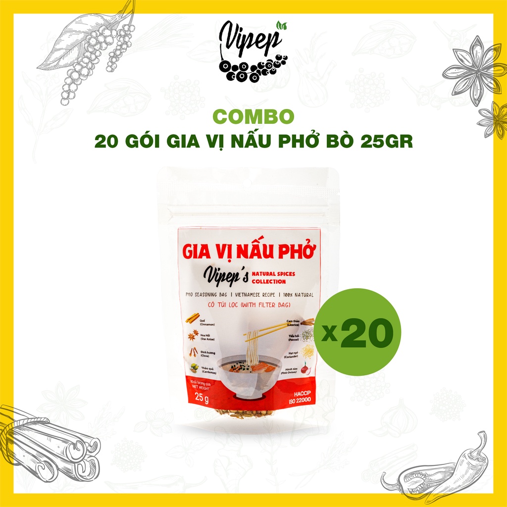 Gia vị nấu phở Vipep là sự tích hợp các gia vị tự nhiên giúp các bạn trẻ dễ dàng tự tay vào bếp chế biến phở Hà Nội hay phở Sài Gòn tuỳ thích. - Quy cách đóng gói: Gói 25g - Thương hiệu sản xuất: Việt Nam - Hạn sử dụng: 18 tháng - Sản phẩm được sản trên dây chuyền thiết bị tiên tiến nhất đạt chứng nhận ISO 22000