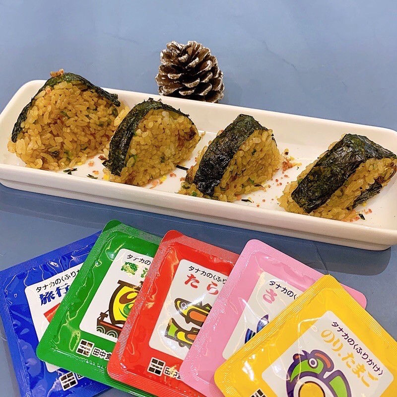 Gia vị rắc cơm Tanaka Furikake gồm 30 gói nhỏ chia làm 6 vị khác nhau: - Cá thu rong biển. - Cá ngừ nướng Mirin. - Trứng rong biển. - Rong biển. - Cá hồi. - Trứng cá tuyết.