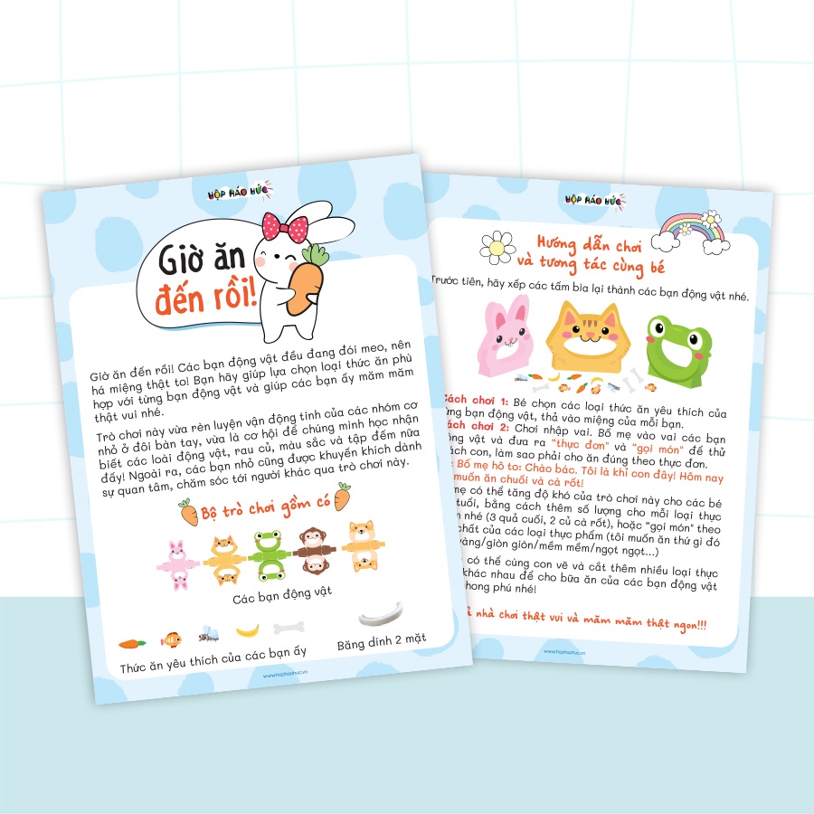 CÙNG CON MĂM MĂM THẬT NGON VỚI ĐỒ CHƠI THÔNG MINH CHO BÉ CƯNG XỈU TỪ HỘP HÁO HỨC “GIỜ ĂN ĐẾN RỒI!” là câu nói quen thuộc bạn nhỏ nào cũng nghe hàng ngày... Và đó cũng chính là tên trò chơi siêu vui của tháng 6 cho bé 0-3 tuổi. Trò chơi đảm bảo sẽ giúp bé hào hứng hơn mỗi giờ cơm tới sau khi giúp các bạn động vật lấp đầy chiếc bụng đói meo đó! Đồ chơi học các con vật được làm từ bìa cứng, bo tròn các góc, màu sắc sống động, với những bạn động vật quen thuộc, bé sẽ lần lượt làm nhiệm vụ cho từng bạn ăn. Nhiệm vụ này người lớn có thể thực hiện sau phút mốt, nhưng với con, đó là cả quá trình ghi nhớ, tư duy liên kết đó nha! Bên cạnh cách chơi chính, bố mẹ và bé hoàn toàn có thể vào vai và gọi món theo menu tự sáng tạo ra. Tất cả thực phẩm bố mẹ đều có thể sáng tạo, vẽ thêm để bộ đồ chơi con vật thêm vui, thêm thích.