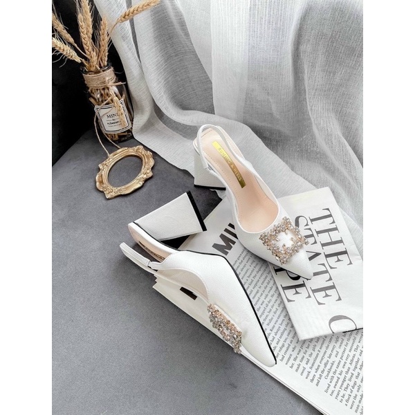 Giới thiệu Giày cao gót mũi nhọn da lì tag hoa đá vuông gót tam giác 9cm