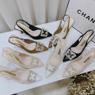 Sandal bít mũi nhọn nơ viền đá nhỏ quai cài gót đũa - 7P