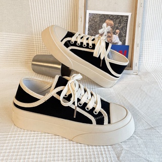 Giày thể thao nữ chất liệu vải canvas, màu đen trắng họa tiết bo viền, đế độn tăng chiều cao [Lù Store] G02
