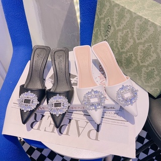 Guốc mũi nhọn khoá hạt đá vuông gót nhọn 3p