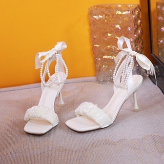 Giày Sandal Cao Gót Nữ Gót Vuông Cao 7 Phân Đính Nơ Ren Xinh Xắn K1NR