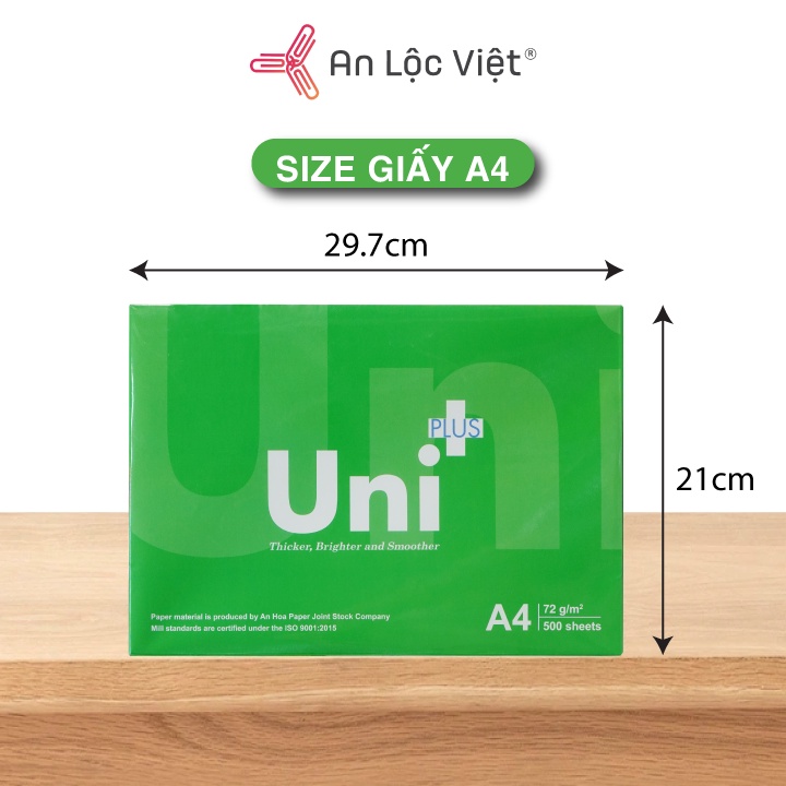 Giấy A4 Uni Plus đạt tiêu chuẩn ISO 9001:2015 do Nhà máy Giấy An Hòa sản xuất tại Việt Nam với chi phí và nguyên vật liệu rẻ hơn nhiều so với các dòng giấy nhập khẩu.