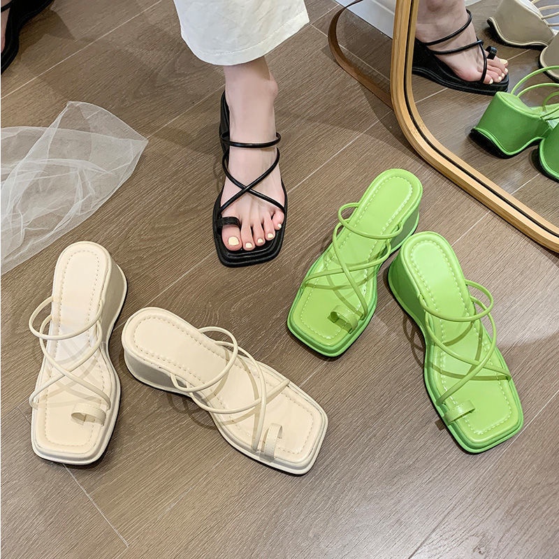 [Hoàn Trả Gói vận chuyển] Dép và dép La Mã phụ nữ mặc ngoài 2022 mới gót nêm mùa hè thời trang lưới màu đỏ đen dép tông cao gót dép xỏ ngón mùa hè