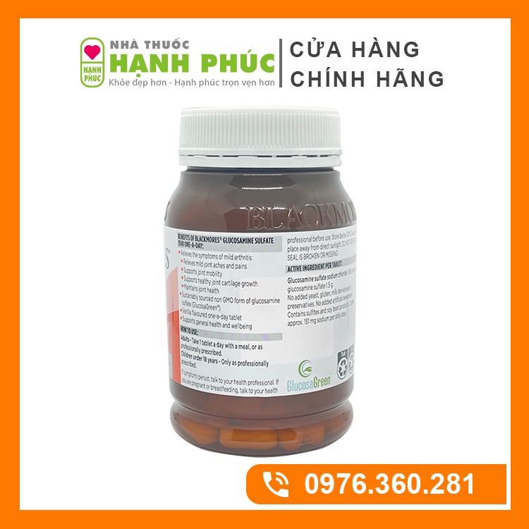 HÀNG CHÍNH HÃNG, ĐÚNG ẢNH, BẢO QUẢN ĐÚNG TIÊU CHUẨN NHIỆT ĐỘ Blackmores Glucosamine 1500mg Của Úc cung cấp dưỡng chất để nuôi dưỡng, tái tạo sụn khớp, làm giảm các triệu chứng thoái hóa khớp, đau khớp, giúp người bệnh đi lại, vận động dễ dàng hơn. - Đã được nghiên cứu và điều chế bởi những chuyên gia hàng đầu, hàm lượng Glucosamine 1500mg đã được kiểm chứng lâm sàng là có hiệu quả trong việc hỗ trợ điều trị bệnh lý xương khớp, làm giảm cơn đau khớp trong thời gian dài sử dụng. - Viên Glucosamine 1500mg của Úc không chứa thành phần hóa học khác gây ảnh hưởng đến sức khỏe, tuy nhiên những người dị ứng với hải sản không nên dùng sản phẩm này. - Viên uống dễ dàng hấp thu vào cơ thể, và có hiệu quả từ khoảng sau 2 -3 tháng liên tục sử dụng *CÔNG DỤNG: - Cung cấp nguồn dưỡng chất để phục hồi, duy trì và tái tạo sụn khớp - Tăng cường sản xuất dịch nhầy để giúp khớp hoạt động trơn tru, giảm tình trạng cứng khớp, đau nhức. - Kích thích tái tạo mô sụn, tái tạo sụn khớp, từ đó duy trì sụn khớp khỏe mạnh, tránh bị hao mòn, tổn thương bởi gốc tự do. - Duy trì hoạt động bình thường của xương khớp, người bệnh khỏe mạnh hơn, hạnh phúc hơn. *HƯỚNG DẪN SỬ DỤNG: ►Liều dùng: Uống 1 viên mỗi ngày sau bữa ăn. Nên duy trì đều đặn và liên tục trong thời gian dài để có hiệu quả tốt nhất. ►Bảo quản: Bản quản nơi khô ráo, tránh ánh nắng, tránh nhiệt độ quá cao trên 30 độ C ►Lưu ý: - Không sử dụng cho trẻ em và phụ nữ mang thai - Nên tham khảo ý kiến bác sĩ để biết tình trạng bệnh và liều lượng bổ sung phù hợp nhất. - Những người dị ứng với hải sản không dùng sản phẩm này - Những người bị tiểu đường, hạ đường huyết, hay béo phì không dùng Glucosamine. - Glucosamine có thể gây ra tác dụng phụ (rất ít) với 1 số người, hãy tham khảo ý kiến bác sĩ trước khi dùng.