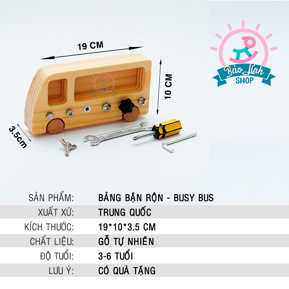Đồ chơi gỗ - Bảng bận rộn Busy Bus là một dạng bảng Busy Board Mini, một trong những món đồ chơi phát triển trí tuệ, phát triển các kỹ năng cơ bản cần thiết cho các bé. Món đồ chơi gỗ nhỏ nhắn này cũng được coi là món giáo cụ Montessori cho các bé có độ tuổi từ 3-5 tuổi bổ sung vào góc thực hành cuộc sống tại nhà.