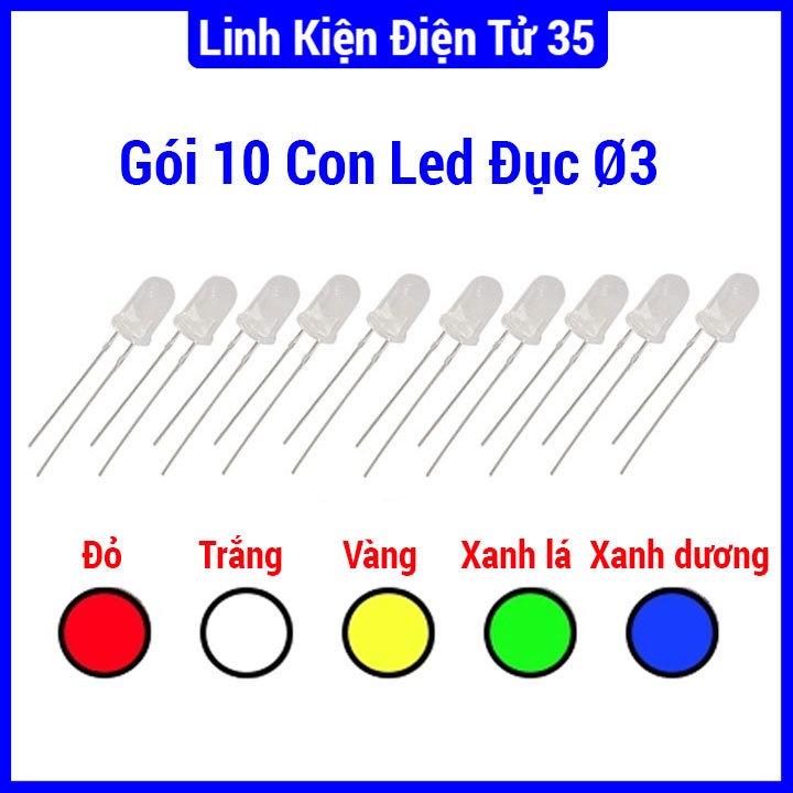 Giới thiệu Gói 10 con Led đục ø3 3-5V màu trắng/vàng/xanh lá/ xanh dương/ đỏ tùy chọn