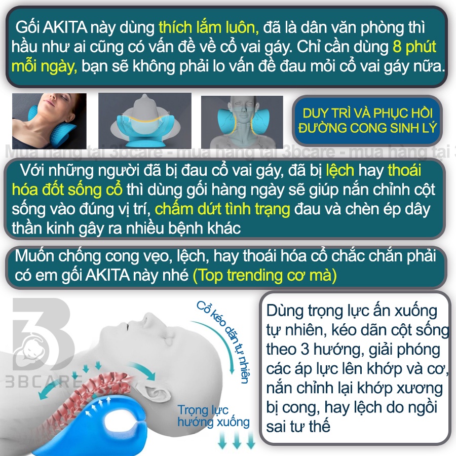 Tại sao nên mua gối Massage chống đau mỏi cổ vai gáy Akita: - Hỗ trợ điều trị thoát vị, cong vẹo cột sống an toàn mà không cần phẫu thuật. - Dễ sử dụng chỉ cần nằm nên gối không cần nhiều thao tác lắp đặt như các loại máy truyền thống. - Giá rẻ chỉ bằng 1/10 máy kéo cồ và 1/ 2 các loại gối khác - An toàn, vì cách kéo là trọng lực của đầu kéo xuống nên không gây chấn thương như các loại dùng lực máy để kéo. - Không lo tái phát lại dùng sử dụng đền mỗi ngày khi bị đau dùng 2 lần 1 lần hết đau sẽ sử dụng 1 lần 1 ngày như vậy cột sống sẽ luôn được bảo vệ. - Dùng để phòng và chữa bệnh: Nếu như các máy kéo cổ chỉ dùng để chữa bệnh thì gối Akita dùng được cả chữa bệnh và phòng bệnh.