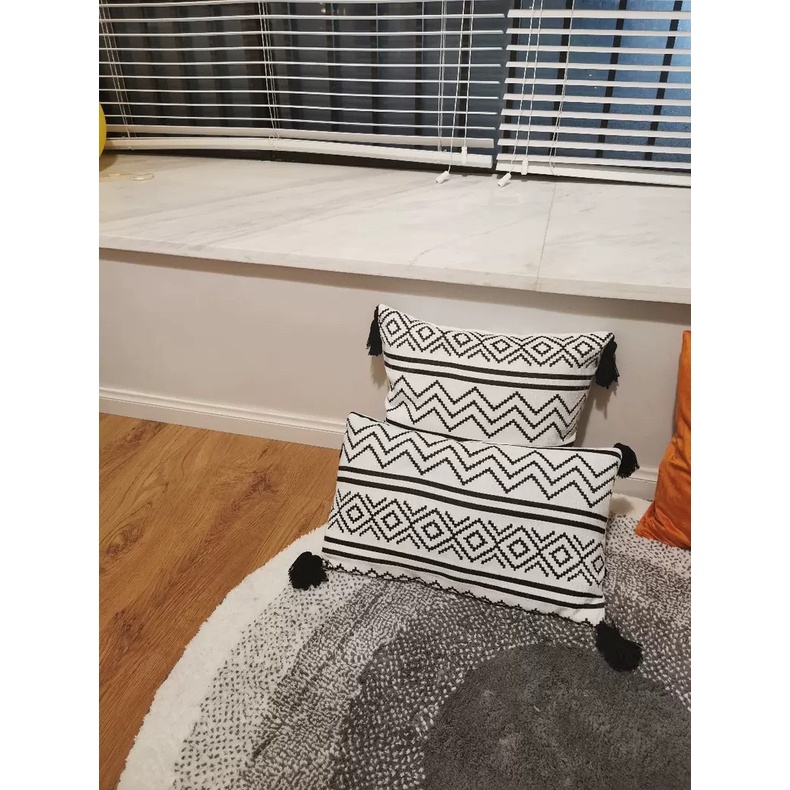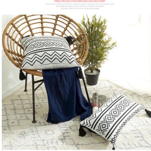 Đặc điểm : - Kích thước: Có hai kích thước là Vuông 45*45cm và Chữ nhật 30x50cm - Ruột : Bông trắng, bông 15D, trọng lương ruột 500g, ruột có khoá kéo. - Vỏ : vải gai canvas dày dặn đen trắng, có tua rua tinh tế Vỏ có khoá kéo tàng hình giọt lệ.