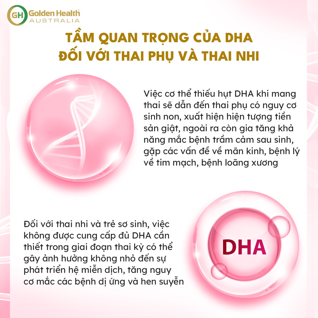 2. CÔNG DỤNG CỦA VIÊN UỐNG BỔ SUNG DHA CHO MẸ BẦU: - Hỗ trợ phát triển thị giác. - Hỗ trợ tăng cường khả năng tập trung. - Hỗ trợ phát triển chức năng thần kinh ở trẻ sơ sinh, cải thiện các vấn đề trí nhớ của mẹ bầu và sau sinh. - Hỗ trợ ngăn ngừa các nguy cơ sinh non, tiền sản giật, các vấn đề về mãn kinh, tim mạch, xương khớp cho mẹ bầu sau sinh. - DHA bầu Golden Health hỗ trợ phát triển trí não ở cả giai đoạn bào thai và sơ sinh. - Hỗ trợ phát triển thị giác và sức khỏe tim mạch ổn định. - Hỗ trợ chăm sóc và ổn định hệ thần kinh của trẻ trong thời kỳ mẹ mang bầu. - Bổ sung DHA cho mẹ trong thời gian cho con bú giúp hỗ trợ sự phát triển chức năng nhận thức ở trẻ sơ sinh.