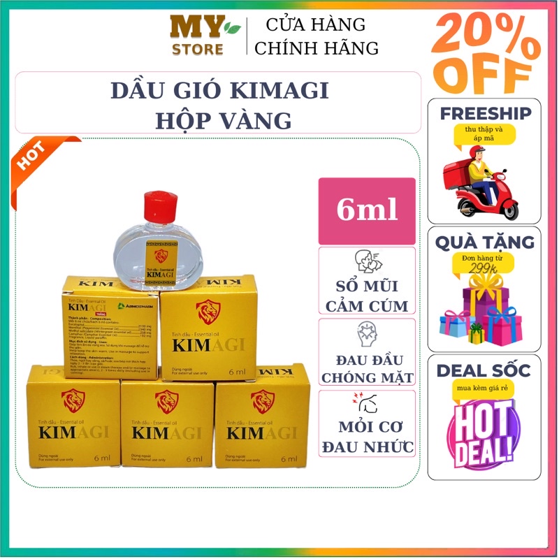 Dầu Gió Kimagi 6ml Là thương hiệu và sản phẩm quen thuộc và lâu đời được người Việt chúng ta tin dùng thuộc công ty dược agimexpharm. Qui cách đóng gói: Chai thuỷ tinh, 6ml. HSD : 3 năm kể từ ngày sx Xuất Xứ:Việt Nam - Hương thơm của dầu gió vừa thanh vừa nhẹ nhàng, nhưng tác dụng và độ nóng từ từ thẩm thấu. - Hít một hơi dầu gió cho bạn cảm giác thư giản, giảm căng thẳng. - Dầu có thể thoa trên vết muỗi cắn, các khớp, vết bầm tím hoặc thoa hay ngửi bất cứ lúc nào. *Thành phần chính: Eucalyptol Menthol Methyl salicylatev Camphor *Công dụng: Xoa bóp giúp làm ấm cơ thể, xông hơi giải cảm, làm dịu vết ngứa do côn trùng cắn. *Cách dùng: - Thoa, ngửi, xông hay xoa bóp (cạo gió) - Xoa bóp ngoài da tại chỗ đau - Người lớn có thể cho 5 – 10 giọt dầu vào bình xông có khoảng 250ml nước nóng *Bảo quản: Bảo quản nơi khô thoáng.