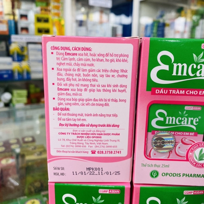 Dùng Emcare xoa hít, hoặc xông đề phòng ngừa: Cảm lạnh, cảm cúm, ho khan, ho gió, khò khè,nghẹt mũi, chảy nước mũi. Xoa ngoài da để làm giảm các triệu chứng: Nhức đầu, chóng mặt, buồn nôn, say tàu xe, chướng bụng đầy hơi, ăn không tiêu. Đối với phụ nữ mang thai sau khi sinh dùng emcare xoa bóp để giúp lưu thông khí huyết, giảm đau mỏi cơ. -Dùng xoa bóp giúp giảm đau khi bị tê thấp, bong gân, sưng viêm, các vết trùng đốt. Bảo quản: -Để nơi khô thoáng, tránh ánh nắng trực tiếp. Để xa tầm tay trẻ em. Đọc kĩ hướng dẫn sử dụng trước khi dùng. Thương Hiệu: Opodis Pharma
