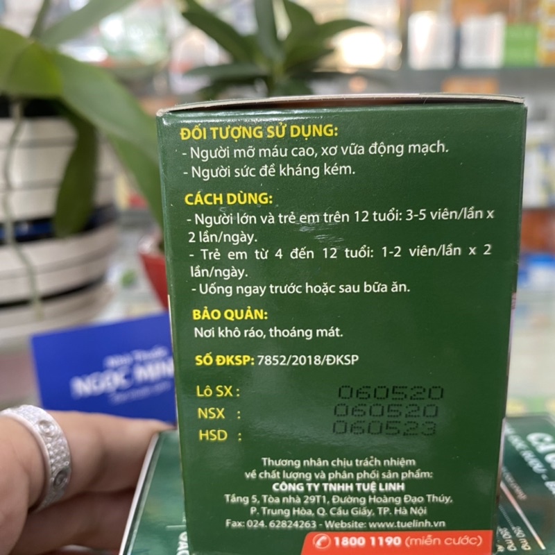 CÔNG DỤNG: Hỗ trợ giúp giảm mỡ máu, giảm nguy cơ xơ vữa động mạch vành, tăng sức đề kháng cho cơ thể. Chú ý: - Thực phẩm này không phải là thuốc và không có tác dụng thay thế thuốc chữa bệnh. - Không sử dụng cho người mẫn cảm với bất kỳ thành phần nào của sản phẩm. ĐỐI TƯỢNG SỬ DỤNG: - Người mỡ máu cao, xơ vữa động mạch. - Người sức đề kháng kém. CÁCH DÙNG: - Người lớn và trẻ em trên 12 tuổi: 3-5 viên/lần x 2 lần/ngày. -Trẻ em từ 4 đến 12 tuổi: 1-2 viên/lần x 2 lần/ngày. - Uống ngay trước hoặc sau bữa ăn. BẢO QUẢN: Nơi khô ráo, thoáng mát.