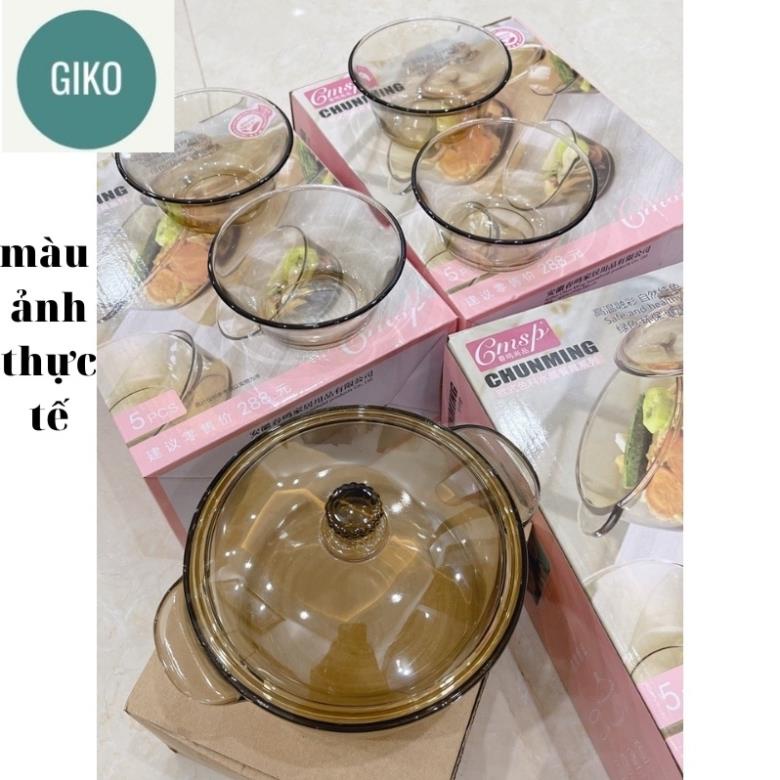 Giới thiệu (HÀNG ĐẸP) Bộ Thủy tinh 5 món gồm 1 thố và 4 bát màu hổ phách