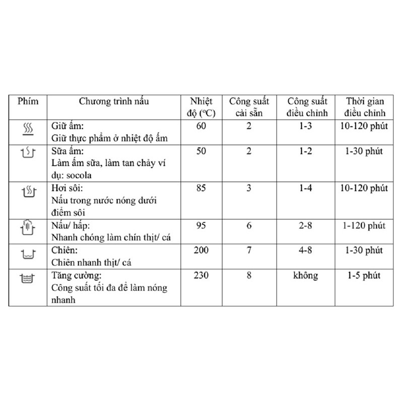 *) Thông tin BẾP TỪ ĐÔI WMF KULT X + Thương hiệu: WMF (Đức) + Điện áp: 220V + Công suất: 3500W + Kích thước: 38.5 x 59 x 4.8 cm + Thời gian bảo hành: 12 tháng *) Về thương hiệu WMF + WMF là thương hiệu đồ gia dụng hàng đầu thế giới. Các sản phẩm của WMF lá sự lựa chon hàng đầu của các chuyên gia nấu nướng và được hàng triệu các bà nội trợ trên thế giới tin dùng. + Ở Việt Nam thương hiệu WMF vẫn còn là cái tên khá lạ lẫm với những người yêu công việc bếp núc hay các bà nội trợ chyên nghiệp, nhưng ở các nước Châu Âu hay Mỹ thì WMF là cái tên rất quen thuộc và nó đã trở thành thói quen hay tập quán sử dụng các dụng cụ làm bếp quen thuộc được hàng triệu người tin dùng và đánh giá rất cao *) Đặc điểm nổi bật của BẾP TỪ ĐÔI WMF KULT X + Thiết kế siêu đẹp: BẾP TỪ ĐÔI CẢM ỨNG WMF Kult X thiết kế cực kì đẹp và sang đảm bảo sẽ làm vừa lòng những khách hàng khó tính nhất. Bếp đun nhanh hơn bếp hồng ngoại/ bếp điện, hiệu quả như bếp gas nhưng an toàn hơn bếp gas rất rất nhiều. + Chất liệu an toàn: BẾP TỪ WMF Kult X có bề mặt bếp được làm chất liệu thủy tinh chịu nhiệt, chịu lực tốt, bóng đẹp, dễ dàng vệ sinh. Điều khiển cảm ứng hiện đại và đơn giản, dễ dàng sử dụng. + Đa dạng mức công suất: BẾP TỪ 2 VÙNG WMF Kult X có 8 mức công suất từ cho bạn sự thoải mái điều chỉnh khi đun nấu và 6 chương trình nấu được cài đặt sẵn: chế độ làm ấm sữa, chế độ giữ ấm thức ăn, chế độ hầm, chế độ hấp, chế độ rán nhanh, chế độ nóng nhanh với công suất tối đa. + Chức năng hẹn giờ với bảng hiển thị điện tử. Bề mặt bếp phù hơp với nhiều đường kính nồi chảo khác nhau, đường kính tối đa 28cm. Khả năng tự nhận diện nồi từ và tắt bếp khi không có nồi đặt trên bếp. Hệ thống an toàn chống quá nóng. *) Chế độ bảo hành BẾP TỪ ĐÔI WMF KULT X + Thời gian bảo hành: 12 tháng + Hỗ trợ kỹ thuật: 24/7 + Hỗ trợ sửa chữa: Trọn đời