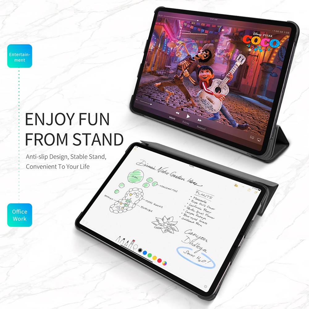 ⚡ Bao da iPad Pro 11" 2018 Chính Hãng Dux Ducis DOMO Series với bề mặt vải Jean bền bỉ, sang trọng, khó bám bẩn và mặt sau nhựa cứng PC giúp ôm chặt & bảo vệ tốt cho máy. ✔️ Bao da được trang bị tính năng Smart Cover: tự động tắt mở máy khi đóng mở nắp bao da thuận tiện trong quá trình sử dụng, tránh hỏng nút nguồn và tiết kiệm pin triệt để. ✔️ Đặc biệt ở phiên bản này, hãng Dux Ducis thiết kế thêm khe trống bên cạnh máy để bút cảm ứng hút nam châm vào iPad. ✔️ Mặt nắp cấu tạo 3 mảnh cuộn gập linh hoạt cho phép dựng máy nhiều tư thế, rất thoải mái khi xem phim, lướt web, soạn thảo văn bản… ✔️ Tổng thể bao da mỏng gọn với trọng lượng nhẹ vừa đẹp lại an toàn cho máy, ,thuận tiện cho người sử dụng. ✔️ Từng chi tiết camera, cổng sạc, loa, phím bấm đều hết sức vừa vặn và hoàn thiện tinh xảo. ✔️ Sản phẩm full box chính hãng Dux Ducis, ở góc bao da có nẹp logo kim loại của hãng.