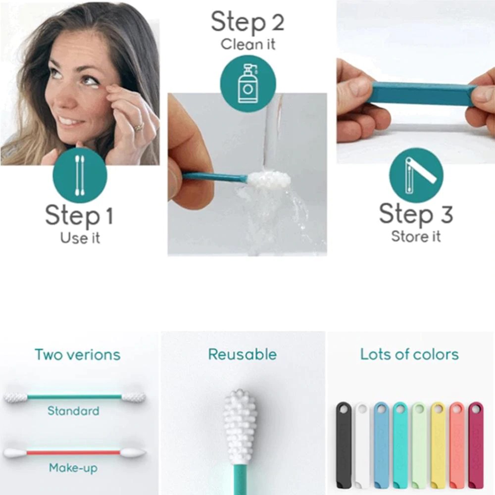 Đặc điểm: - Rất dễ vệ sinh và có thể tái sử dụng chỉ với một ít nước và một chút xà phòng. -Sản phẩm có độ đàn hồi tốt, có thể vệ sinh kỹ lưỡng, cho phép bạn sử dụng lâu dài. - Sản phẩm đi kèm với một hộp đựng tiện dụng chứa hai cây bông tăm có thể tái sử dụng để dễ dàng mang theo bên mình đến bất cứ đâu. - Được làm từ các sợi siêu mềm và linh hoạt ở cuối mỗi tăm bông, rất tốt để loại bỏ vết bẩn, dầu nhờn, lớp trang điểm, v.v. - Phần đầu mềm mại làm bằng silicon. Thiết kế đủ tinh tế để phù hợp với những bộ phận nhạy cảm trên cơ thể và chính xác để trở thành một món đồ trang điểm cần thiết.