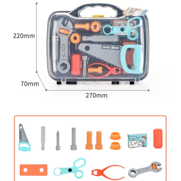 ⚙️Bộ đồ chơi vali kỹ sư được thiết kế nhỏ gọn nhưng vẫn đầy đủ dụng cụ, đầy sống động tạo cảm giác chân thật khi chơi. Bé có thể thực hành các công việc đơn giản như đóng đinh, vặn đai ốc,....