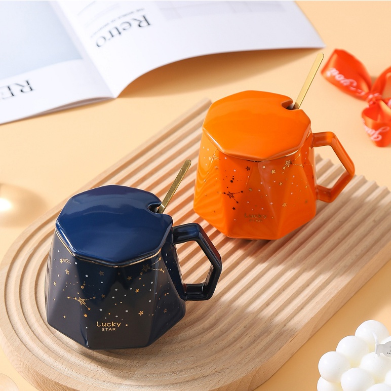 Giới thiệu [Hàng sẵn] Cốc Ly Sứ 400ml Hình Chòm Sao 2 Màu Cam Xanh Kèm Hộp Qùa Nắp Thìa Sang Trọng, Cốc Ly Sứ Uống Nước Cao Cấp